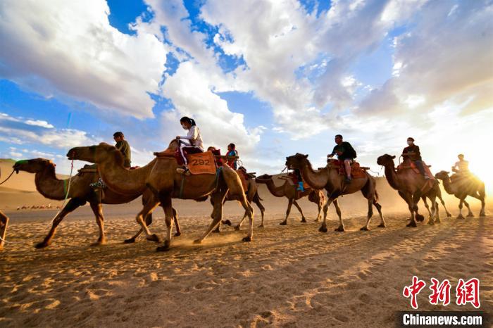 圖為游客騎駱駝?dòng)^賞大漠風(fēng)景?!⊥醣筱y 攝