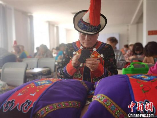 圖為裕固族服飾非遺傳承人為學(xué)員傳授傳統(tǒng)服飾刺繡。 史靜靜 攝