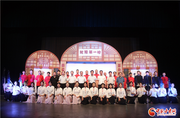 《隴原第一槍》全劇分希望、播火、誆宴、奪槍、功捷5場,演出團(tuán)隊(duì)分為前臺(tái)演唱組、樂隊(duì)伴奏組、影人挑纖組、嘛簧幫唱組,演職人員中有國家級非遺代表性傳承人2人,省級非遺代表性傳承人2人,市級、縣級代表性傳承人近10人,加上隴東音樂學(xué)院學(xué)生共50人參與了演出。
