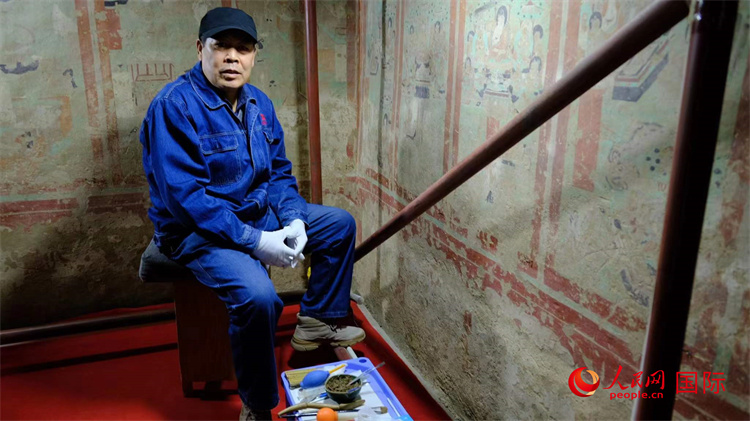 敦煌研究院文物保護(hù)修復(fù)工作者劉濤在工作現(xiàn)場(chǎng)。人民網(wǎng) 呂強(qiáng)攝