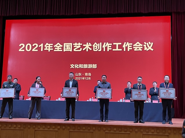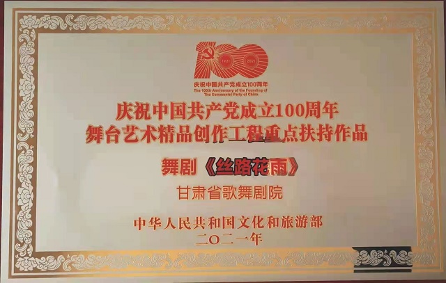 中國甘肅網(wǎng)12月19日訊 12月18日,文化和旅游部在山東省青島市召開的“2021年全國藝術(shù)創(chuàng)作工作會議”上,發(fā)布了“慶祝中國共產(chǎn)黨成立100周年舞臺藝術(shù)精品創(chuàng)作工程”入選名單,頒發(fā)了“慶祝中國共產(chǎn)黨成立100周年舞臺藝術(shù)精品創(chuàng)作工程獎牌”。甘肅省文化和旅游廳遴選推薦的舞劇《絲路花雨》《大夢敦煌》《彩虹之路》、隴劇《官鵝情歌》、小品《你笑起來真好看》等5部舞臺藝術(shù)精品,經(jīng)文旅部評審正式入選“舞臺藝術(shù)精品創(chuàng)作工程重點扶持作品”。甘肅省歌舞劇院創(chuàng)排的舞劇《絲路花雨》作為12家“百年百部”工程受獎單位在全國藝術(shù)創(chuàng)作工作會議上接受獎牌和榮譽證書,甘肅省文旅廳、山東省文旅廳等參會代表12家領獎單位上臺領獎,充分展現(xiàn)了文旅部對甘肅省入選作品質(zhì)量及組織工作的高度肯定。
