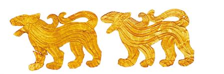 受草原文化影響,虎的造型更具藝術(shù)性,形式亦豐富多彩。甘肅省博物館藏的西周虎紋耳形銅鉞,整體似半環(huán),鑄猛虎紋,虎背為刃。尾下有短胡兩穿,尾、雙爪上鑄凹槽,虎首下彎,張口含銎,露牙睜目,領(lǐng)內(nèi)有一圓形穿孔。甘肅省文物考古研究所藏的戰(zhàn)國(guó)金帶鉤,鉤首為長(zhǎng)頸龍首狀,頸部為三棱狀,肩部三角形邊框內(nèi)鏤空雕鑄對(duì)稱和狼形圖案。鉤身為長(zhǎng)方形,邊框內(nèi)鏤空雕刻一組正反相對(duì)稱的虎噬大角羊圖案。張家川回族自治縣博物館藏的戰(zhàn)國(guó)晚期的虎形金飾片,虎尖耳上翹,大嘴張開,鬃毛卷曲上翹,尾前卷于背部與鬃毛相連,四足著地做行走狀,栩栩如生地展現(xiàn)了虎行走的動(dòng)感之態(tài)。甘肅省博物館藏的戰(zhàn)國(guó)虎噬羊紋金飾片,虎張口露齒,垂首蹲踞,虎口銜羊,前爪按住羊肩部,后爪抓住羊臀部,羊四肢跪地作掙扎狀,活靈活現(xiàn)地展現(xiàn)出猛虎捕食羊的瞬間動(dòng)態(tài),形象逼真。這些虎文物都是此次展覽中的亮點(diǎn)。