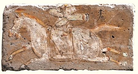 敦煌市博物館藏的西晉李廣射虎彩繪畫像磚表現(xiàn)的是“李廣射虎”的情景。李廣頭戴冠,八字須,著交領(lǐng)窄袖衣,系腰帶,下身著裈,騎于疾奔的馬上返身張弓待發(fā)。李廣射虎的故事被記載于司馬遷《史記》中,原文是:“廣出獵,見草中石,以為虎而射之,中石沒(méi)鏃,視之石也。因復(fù)更射之,終不能復(fù)入石矣。廣所居郡聞?dòng)谢?,嘗自射之。及居右北平射虎,虎騰傷廣,廣亦竟射殺之。”