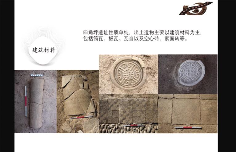 此前勘探發(fā)現(xiàn),四角坪遺址外圍為夯土圍墻,中部為面積約900多平方米的方形夯土臺(tái)基,臺(tái)基頂部四周有回廊式建筑。經(jīng)過兩年的發(fā)掘,摸清了夯土臺(tái)基的形制,發(fā)現(xiàn)了臺(tái)基中心較特殊的半地穴式建筑,以及臺(tái)基外圍第一排附屬建筑。每組建筑之間有寬約一米的夯土通道連接,建筑周圍散落各種建筑構(gòu)件,如板瓦、筒瓦、瓦當(dāng)、空心磚等。通過考古發(fā)掘顯示,四角坪遺址建筑體量巨大,等級(jí)分明,格局規(guī)整對(duì)稱,是秦帝國時(shí)期代表國家意志的禮制性建筑群。