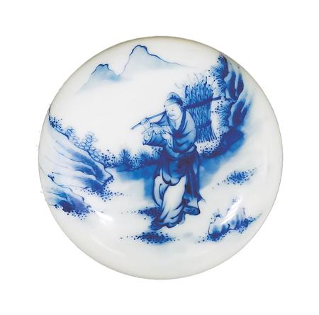 一件是青花印泥盒,制作于20世紀(jì)初。直徑7厘米,高3厘米,盒身扁圓,鼓腹,上下相合。盒蓋用青花繪“樵夫讀書”圖。畫面遠(yuǎn)處,兩座山峰高聳云間,四周樹木蔥蘢,山石嶙峋。畫面正中的山路上,一樵夫砍柴歸來,身背一大捆柴草,他右手扶著木棍,左手則捧著一本書,雙眼盯著書本,緊抿嘴唇,正津津有味地邊走邊讀。讀到精彩處,露出會(huì)心一笑??磥?,這個(gè)樵夫是極愛讀書的,這種好學(xué)精神,難道不值得我們學(xué)習(xí)嗎?這件瓷印泥盒,青花色澤典雅,人物衣褶神態(tài)描繪細(xì)致,栩栩如生,胎體堅(jiān)致,白釉溫潤(rùn),層次清晰,保存完好。