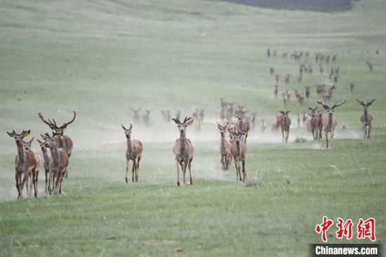 夏日時節(jié),位于祁連山北麓的甘肅省張掖市肅南裕固族自治縣,數(shù)百頭馬鹿在草原上崩騰、休憩覓食?!钇G敏 攝