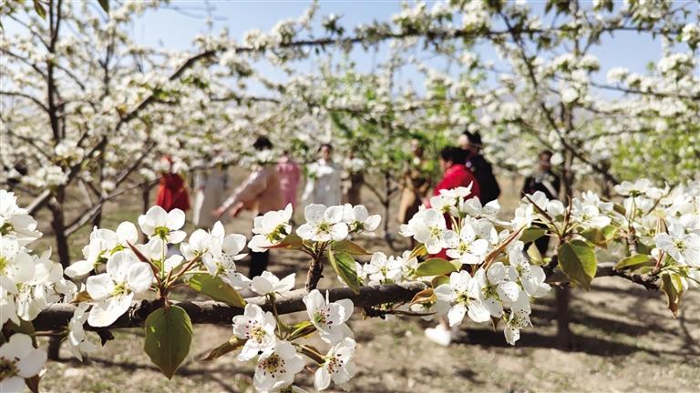 清新的花香映紅了游客的笑臉,有人在梨花樹下翩翩起舞,有人在梨花叢中游覽拍照,有人在梨花樹下放聲歌唱。梨花詩會如期舉辦,配樂詩朗誦《千古涼州》、藏族舞蹈《故鄉(xiāng)》、合唱《祝福祖國》、旗袍秀《飛韻江南》等眾多節(jié)目吸引了游客的目光。連日來,涼州區(qū)西營鎮(zhèn)2200畝梨花競相綻放,遠(yuǎn)處蜿蜒起伏的祁連山和眼前雪花般紛紛揚(yáng)揚(yáng)的梨花構(gòu)成了一幅美麗的鄉(xiāng)村畫卷。