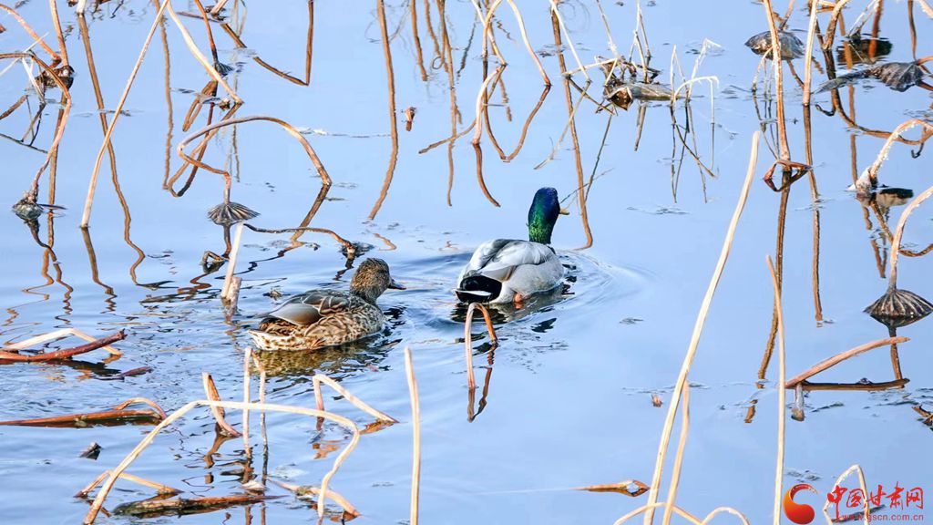 冬日的崇信縣龍澤湖,枯殘的荷葉、蓮蓬與枝干倒映水中,一株株枯荷挺著一身風(fēng)骨靜靜地佇立在湖中,鳳頭鸊鷉、鴛鴦、秋沙鴨、赤麻鴨等成群結(jié)隊(duì)的候鳥在枯荷間嬉戲,舞出了不一樣的冬韻。
