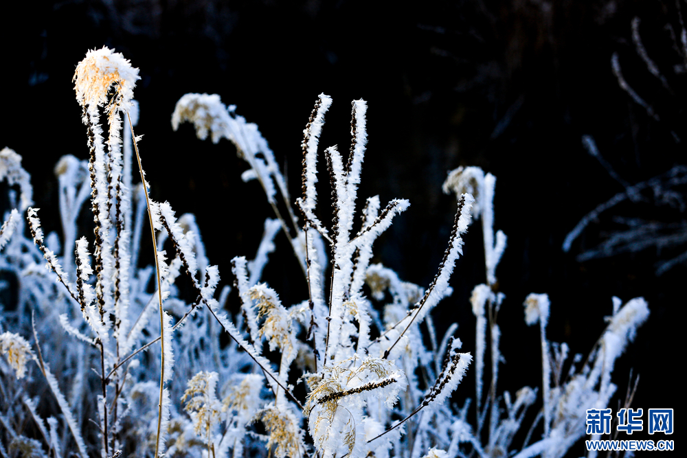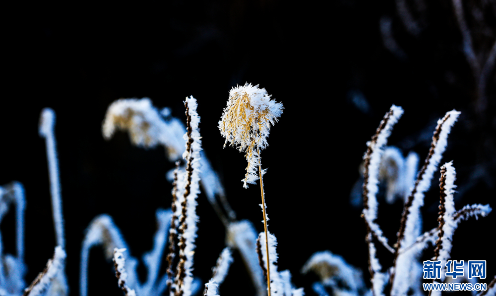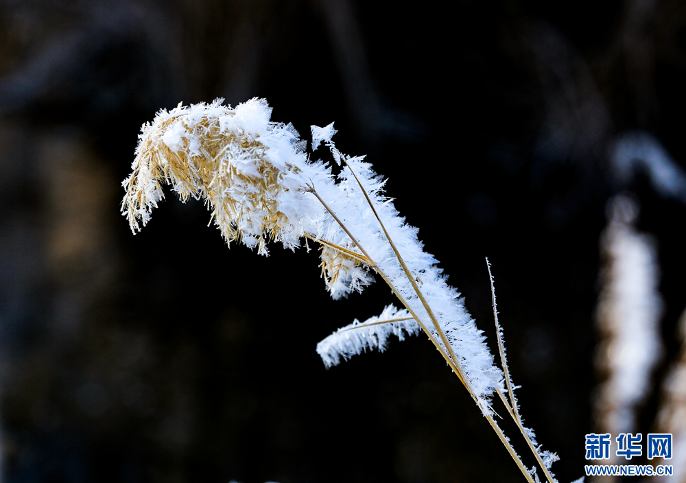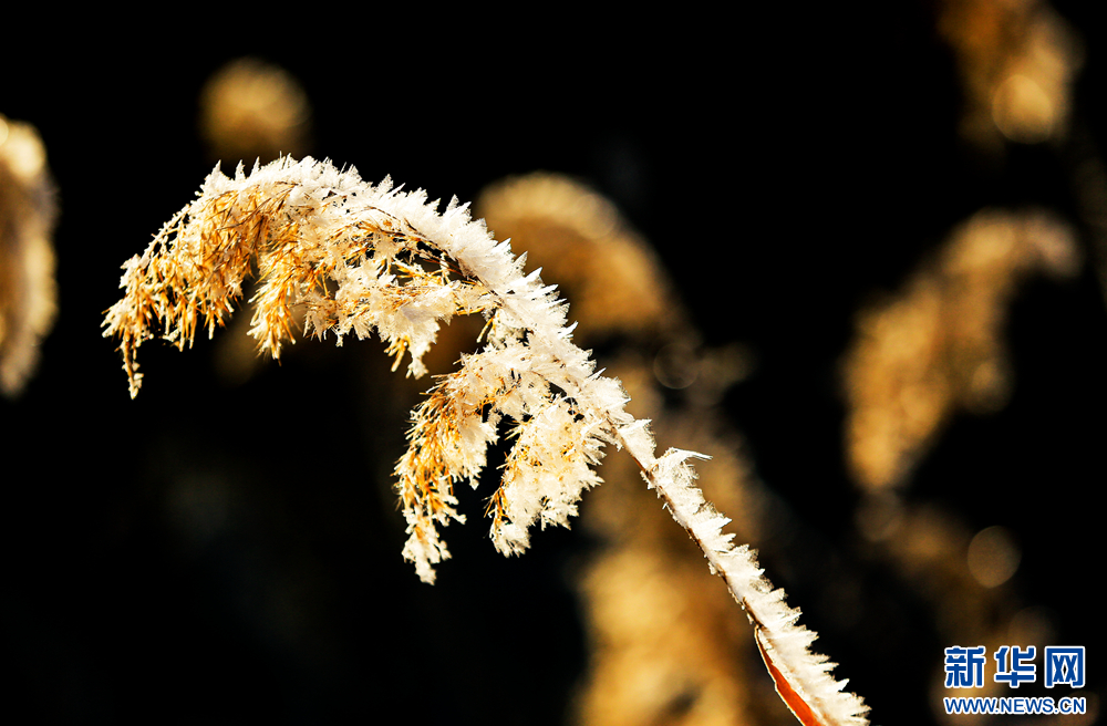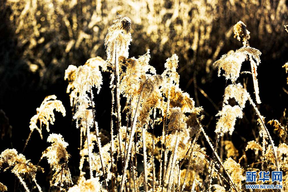 冬日里,甘肅省張掖國家濕地公園蘆葦叢中的蘆花掛滿冰花,晶瑩剔透,美不勝收。新華網(wǎng)發(fā)(陳禮 攝)