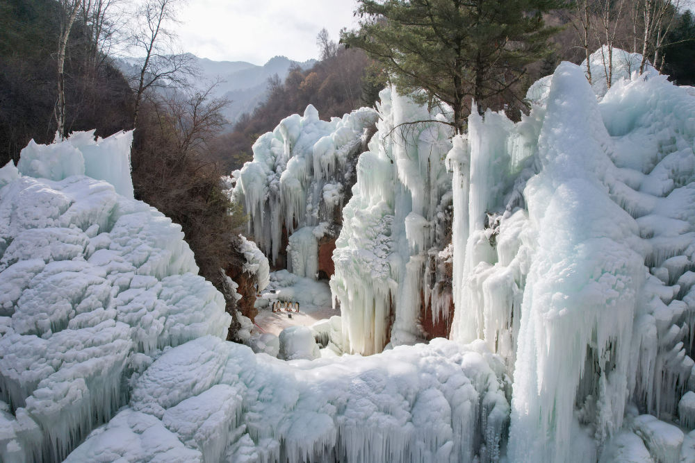 這是1月17日拍攝的渭源縣天井峽西部雪谷內(nèi)的冰瀑景象(無人機照片)。新華社記者 張智敏 攝