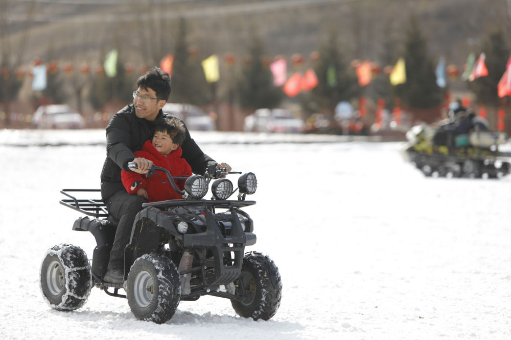 1月16日,在渭源縣田家河鄉(xiāng)元古堆村冰雪樂園,游客在體驗雪地摩托。新華社記者 方欣 攝