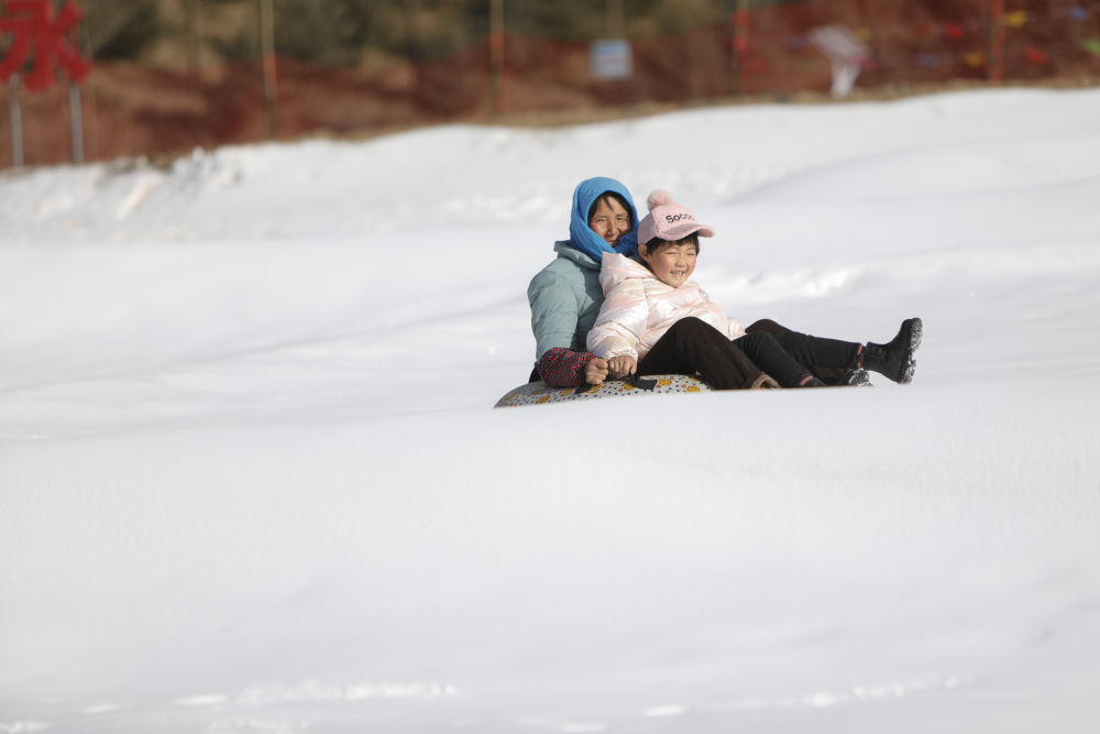 1月16日,在渭源縣田家河鄉(xiāng)元古堆村冰雪樂園,游客在滑雪圈。新華社記者 方欣 攝