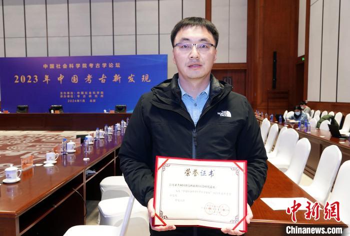1月30日,2023年中國(guó)考古新發(fā)現(xiàn)在北京揭曉發(fā)布,肯尼亞共和國(guó)博高利亞湖舊石器時(shí)代遺址入選中國(guó)2023年國(guó)外考古新發(fā)現(xiàn),趙清坡代表項(xiàng)目領(lǐng)取榮譽(yù)證書在會(huì)場(chǎng)留影。中新網(wǎng)記者 孫自法 攝