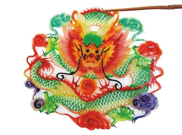 國家級非物質(zhì)文化遺產(chǎn)項目——皮影戲(環(huán)縣道情皮影戲)代表性傳承人高清旺,以當(dāng)?shù)剜l(xiāng)土風(fēng)情為素材,選用優(yōu)質(zhì)牛皮,經(jīng)過炮制牛皮、畫好樣稿、陰陽雕刻、顏料上色、燙熨出水、裝訂完成等雕刻工藝流程,制作成了龍年大吉圖案。