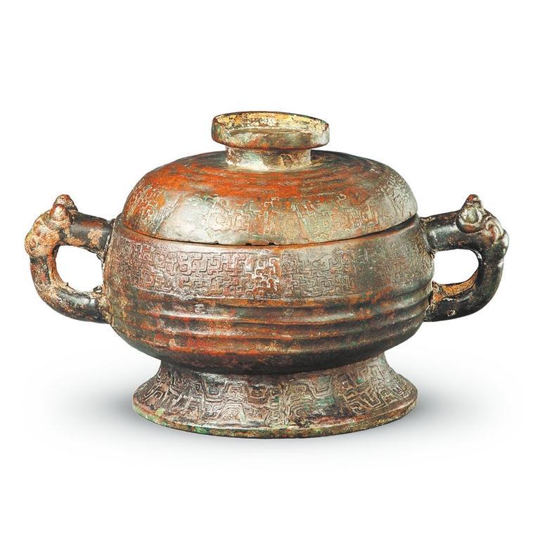 中國國家博物館收藏的秦公簋,1921年甘肅天水出土,簋呈圓形,蓋與器身相合成一略扁而圓的形體,蓋頂有圓形捉手,蓋邊緣及器口下飾勾連形蟠螭紋。蟠螭紋又稱交龍紋,流行于春秋中晚期至戰(zhàn)國早期,有一種由兩條或兩條以上小龍相交,組成紋飾單元,密布于器物表面。