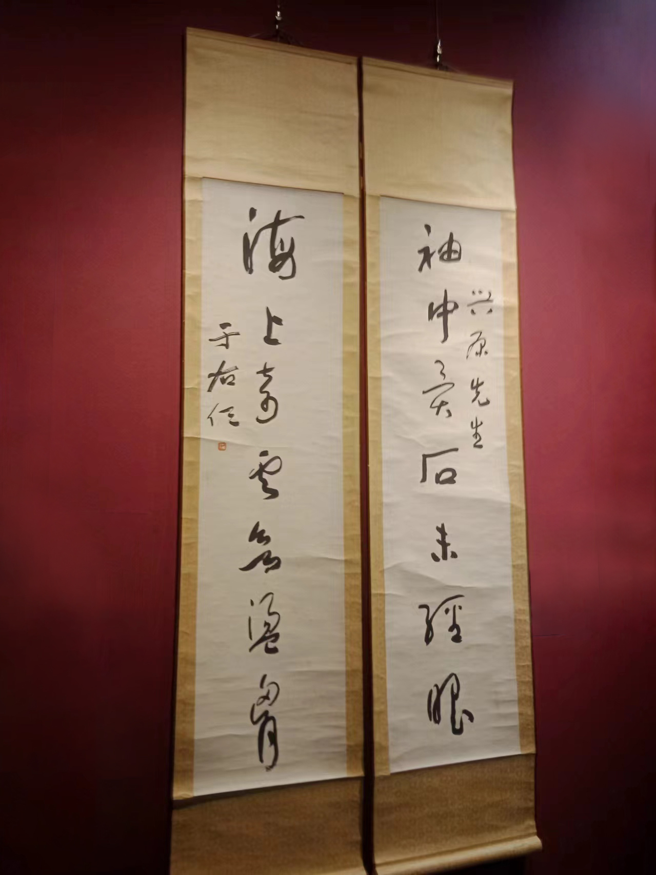 這次展出的于右任先生書法十余幅,有草書、行書和楷書。草書古詩“蜀本九經(jīng)最先出,后來孳乳到長興。蒲津毋氏家錢造,海內(nèi)通行價倍增(此幅落款‘五十一年’,應(yīng)是1962年先生去世前的作品)”,行書七言聯(lián)“袖中異石未經(jīng)眼,海上奇云未蕩胸”,楷書七言聯(lián)“萬卷藏書宜子弟,十年種木長風(fēng)煙”等,書藝嫻熟,各有特色。所展墨寶筆法老練,墨氣逼人,筆者懷著崇敬的心情駐足敬賞,猶如與先生會面,久久不忍離去。