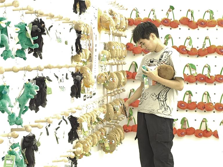 此時,目不暇接的花式文創(chuàng)在店內(nèi)“爭奇斗艷”,爭當(dāng)“顯眼包”,等待被主人帶回家。掀開店內(nèi)一只毛絨收納箱,一窩土豆子撲閃著大眼睛向你眨眼。都說轉(zhuǎn)角遇到愛,誰料,轉(zhuǎn)角處粉嘟嘟的“拿捏玩偶娃娃公仔”捏著一個小蓮花花苞在向你招手。一回頭,造型別致的文創(chuàng)飾品精美又時尚,一側(cè)的帆布包上印著“別卷我”。就連記者逛下來,都入手兩件文創(chuàng)。