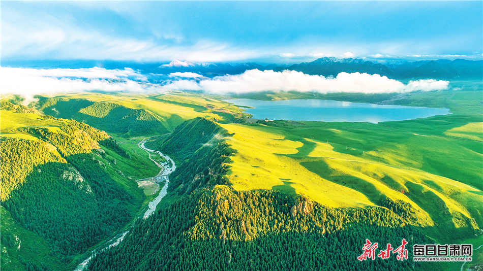 白雪皚皚的祁連山下,一眼望不到邊的大片牧草青翠碧綠,色彩斑斕的野花競相開放,擁有百萬畝草原的山丹馬場如巨幅彩色畫卷徐徐展開。