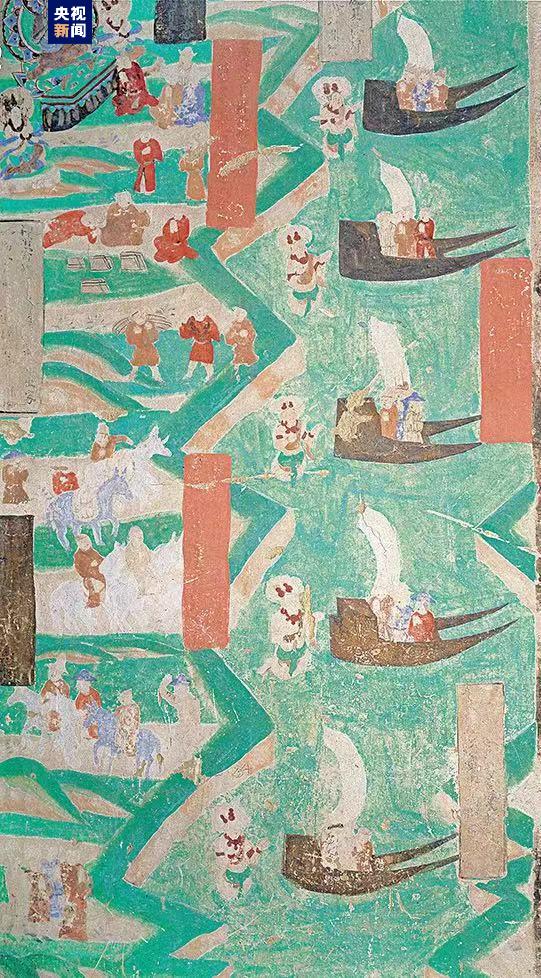雙尾帆船:五只雙尾帆船方頭平底,尾尖上翹呈燕尾狀,每只船上均坐三人,河岸曲折蜿蜒,岸上行人往來穿梭,一場(chǎng)盛大的航行正在啟幕。莫高窟第98窟,五代。