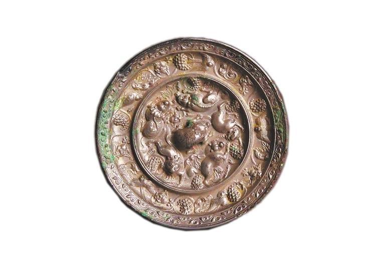 我省天水市博物館的眾多藏品中,有一面海獸葡萄紋銅鏡,大致出現(xiàn)于武則天執(zhí)政時(shí)期(684年—705年)。銅鏡上五只瑞獸作匍匐狀,攀援著葡萄枝蔓,這里的海獸就是來自西域的獅子,古人稱為“狻猊”。此外鏡上葡萄藤葉鋪陳、點(diǎn)綴著禽鳥和卷草,精美絕倫,彰顯著大唐開放包容的盛世氣象。