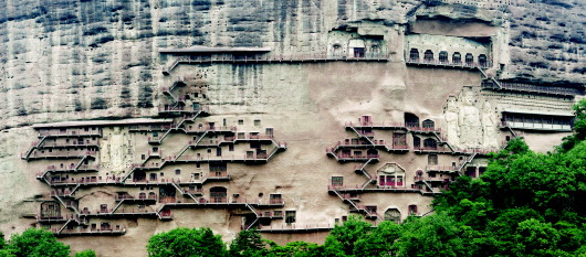 麥積山石窟與敦煌莫高窟、大同云岡石窟、洛陽龍門石窟齊名,是中國四大石窟之一,被譽(yù)為“東方雕塑陳列館”。公元759年杜甫流寓天水,作《山寺》詩:“野寺殘僧少,山園細(xì)路高。麝香眠石竹,鸚鵡啄金桃。亂石通人過,懸崖置屋牢。上方重閣晚,百里見秋毫。”其自然景觀與人文景觀完美結(jié)合,是世界文化遺產(chǎn)、全國重點文物保護(hù)單位,也是中原北方地區(qū)最早的皇家石窟,洞窟內(nèi)還保存了中國最早的連環(huán)畫作品。