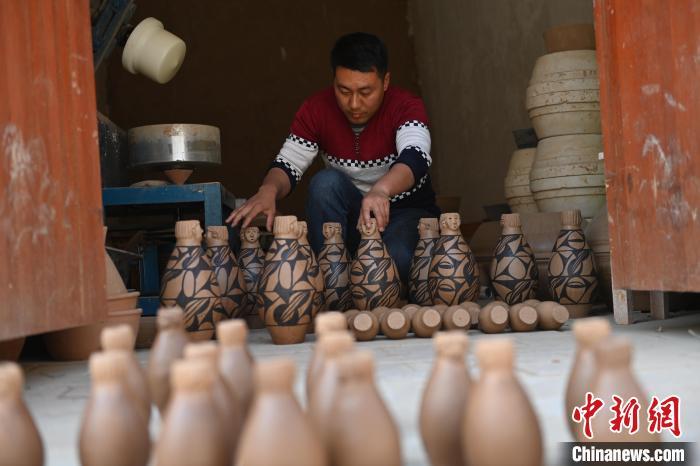 4月11日,甘肅省天水市秦安縣康坡村陶藝車(chē)間內(nèi),甘肅省級(jí)非物質(zhì)文化遺產(chǎn)名錄秦安陶器燒制技藝天水市級(jí)傳承人康曉龍趕制大地灣文創(chuàng)彩陶。李亞龍 攝