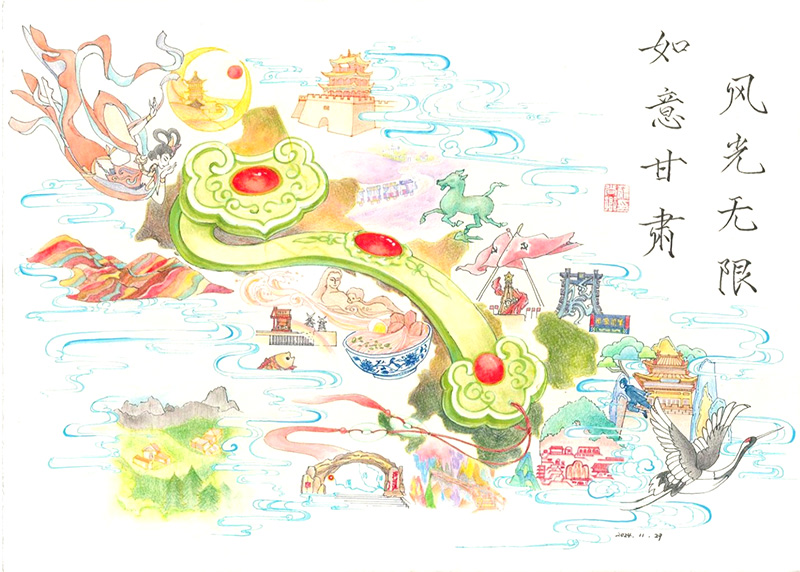 筆者作為編者之一,在一開始接觸到“如意甘肅”這個概念時,就感受到了一種撲面而來的畫面感和強(qiáng)烈的色彩張力,而在精讀《如意甘肅》的過程中,這種感覺愈發(fā)清晰和強(qiáng)烈,一幅黃土高原、廣袤草原、茫茫戈壁、潔白冰川為底色,十四個市州的人文自然美景簇?fù)憝h(huán)繞,一柄通體翠綠、晶瑩無瑕的“玉如意”居中凝型,璀璨奪目的文化如點(diǎn)點(diǎn)紅寶石鑲嵌其中的構(gòu)圖呼之欲出。隨著理解認(rèn)識的逐步深入,本書喚起了我的思想共鳴和對家鄉(xiāng)深沉熱烈的情感流動,并繪制了這幅印象畫,以填補(bǔ)文字和語言所不能盡興之處。我真切地希望,隨著《如意甘肅·甘肅省情研究》的發(fā)行和推廣,隨著美好甘肅的不斷發(fā)展和進(jìn)步,在未來,人們心中的甘肅,不再是“苦瘠甲于天下”的荒涼意象,而是這柄溫潤澄澈、莊重堅(jiān)實(shí)的“玉如意”,和圍繞著、托舉著它的那些繽紛美景和璀璨文化!