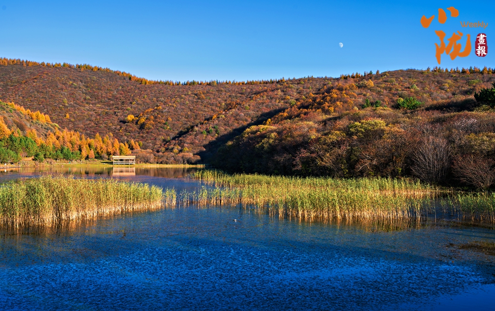 群山環(huán)抱里的朝那湫,水面開闊,清澈透明,周圍層林盡染,藍(lán)天、蘆葦?shù)褂霸诿鲀舻乃嫔?,恰似一幅絕妙的山水風(fēng)景圖。