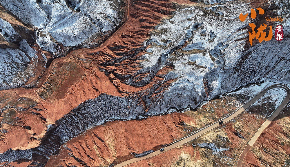 冬雪覆蓋在色彩斑斕的丹霞地貌之上,從高空俯視,層理交錯(cuò),色彩鮮艷,似一幅油畫。