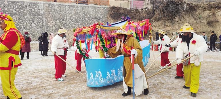 旱般表演時節(jié)奏由慢漸快,闖激流、過險灘,同時,彩扇、華燈秧歌隊協(xié)同表演,并以《十道河》《迎春歌》等伴唱,用三弦、二胡、笛子等伴奏的隴上民間小調(diào)烘托氣氛。