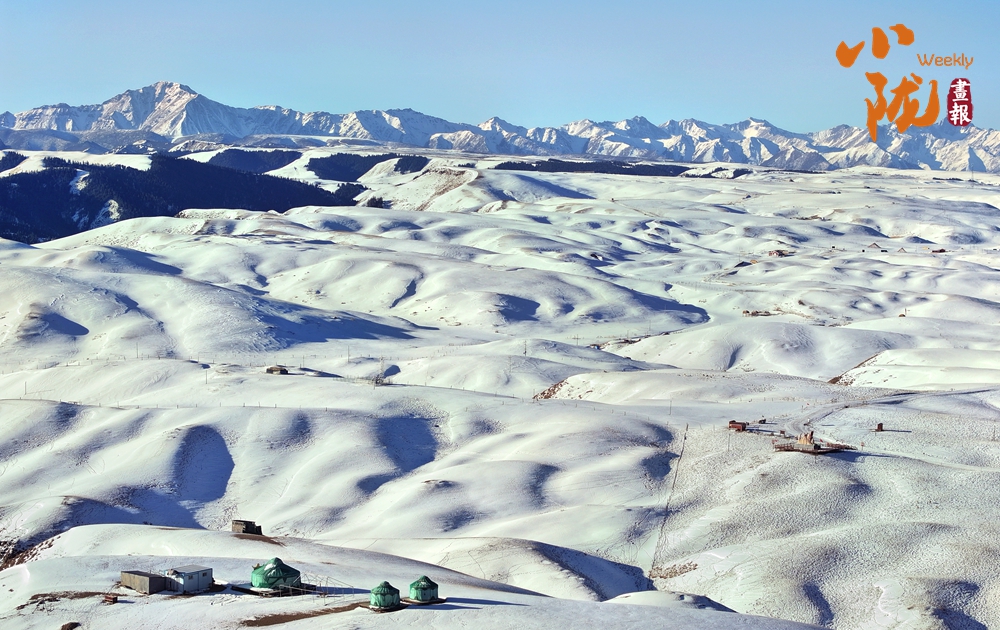 湛藍的天空下,山巒層層疊疊,銀裝素裹,閃爍著耀眼的光芒。