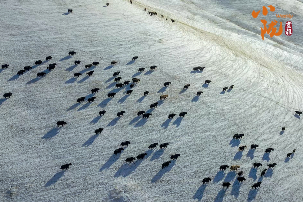 牛群在雪地中悠閑地覓食,和雪景相映成趣,給這片寧靜的草原帶來了生機與活力。