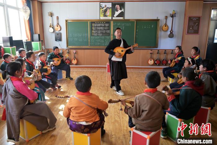 2月26日,甘肅省甘南藏族自治州瑪曲縣寄宿制藏族小學龍頭琴彈唱社團活動,加措正在教孩子們彈唱。九美旦增 攝
