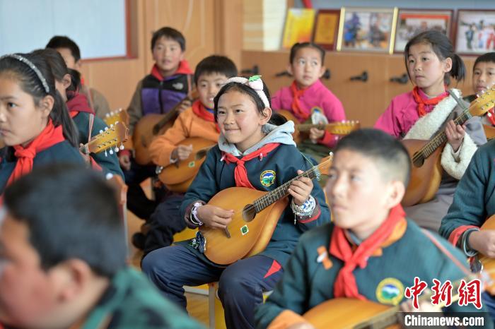 中新社記者近日探訪瑪曲縣寄宿制藏族小學彈唱社團活動,未進教室,已聽到室內傳出的歡快琴聲和笑聲。