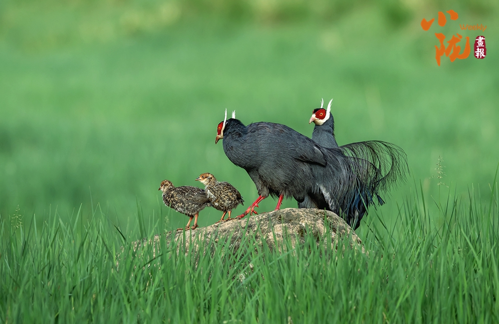 珍貴稀有的國家二級重點(diǎn)保護(hù)動物藍(lán)馬雞,體型較大,通體藍(lán)灰色,頸項(xiàng)和肩部顏色更深,閃爍著金屬般的輝亮。其尾羽特別長,由灰藍(lán)色漸變?yōu)榘底纤{(lán)色,并渲染著金屬綠和金屬紫藍(lán)色,24枚尾羽中,中央一對尾羽特別長,富有彈性,彎曲成一個美麗的弧形,高高地翹在其他尾羽之上,披散下垂如馬尾,因而得名。此外,藍(lán)馬雞的頭側(cè)緋紅,耳羽簇白色并突出于頸部頂上,為其增添了獨(dú)特的魅力。