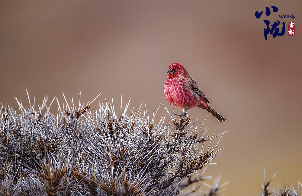 紅眉朱雀,是雀形目燕雀科朱雀屬的鳥類,中等體型,體長約為15厘米。雄鳥的特征是眉紋和臉頰呈淡紫粉色,而上體則有褐色斑駁。雌鳥沒有粉色,難稱“漂亮”,它們?nèi)砘液稚?,?ldquo;朱”一點(diǎn)也不沾邊兒,實(shí)際上,很多鳥類的雌鳥都要比雄鳥暗淡很多,這種暗淡的顏色能幫助它們在孵卵的時候更好地隱蔽,以逃過天敵的捕殺。雄鳥和雌鳥都類似于體型較小的曙紅朱雀。