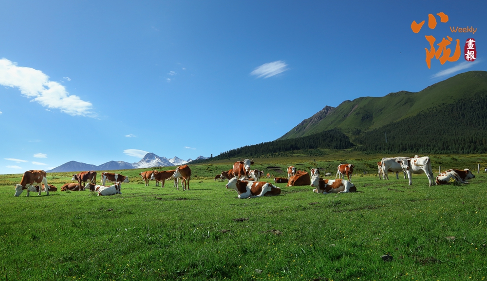 草原碧綠如茵,山巒巍峨壯觀,天空湛藍(lán)如洗,云朵輕盈如紗,矯健的駿馬肆意奔騰,成群的牛羊悠閑地吃草,宛如散落在綠色海洋中的珍珠。
