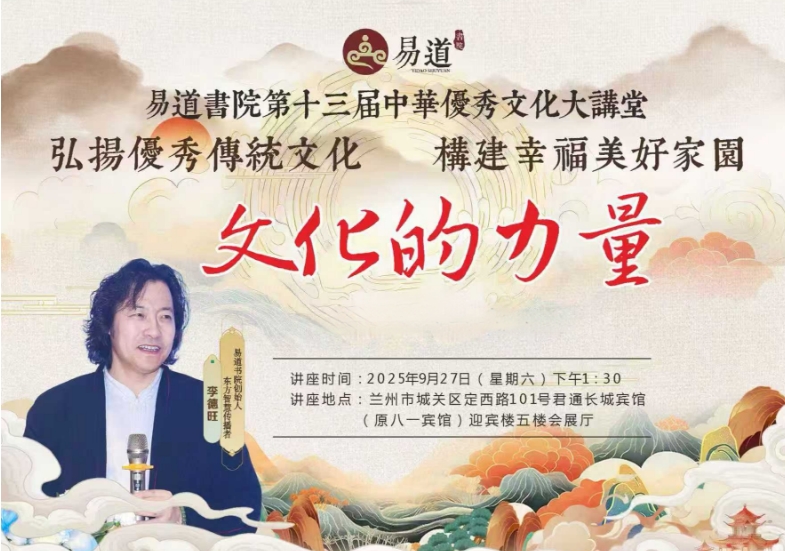 響應時代號召,弘揚傳統(tǒng)文化,旨在文化賦能行業(yè)發(fā)展,易道書院第十三屆中華優(yōu)秀文化大講堂將于9月27日在蘭州君通長城賓館(原八一賓館)迎賓樓五樓會展廳開講,誠邀有志之士共襄盛舉,學習傳統(tǒng)文化,賦能行業(yè)文明,構建美好家園!