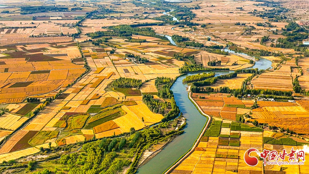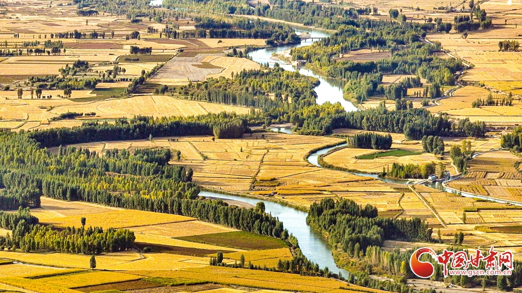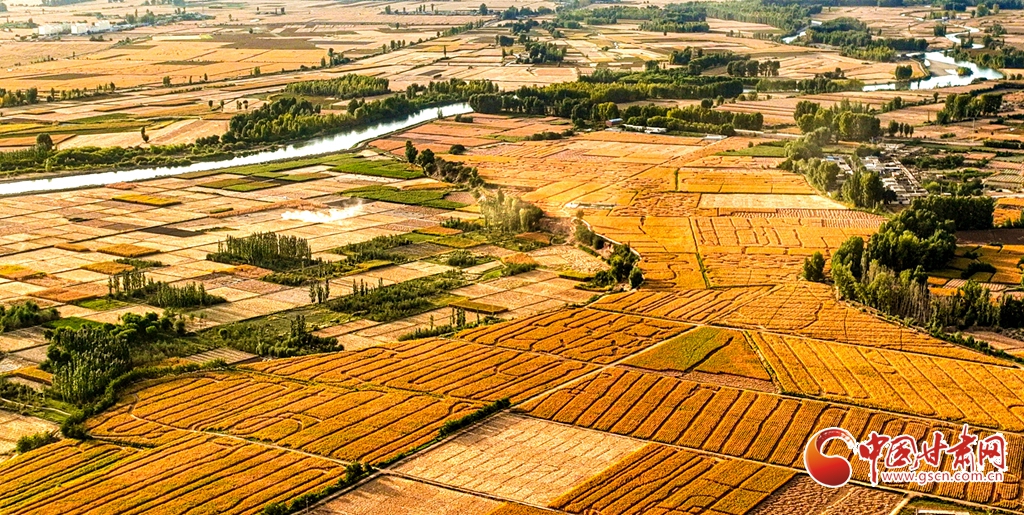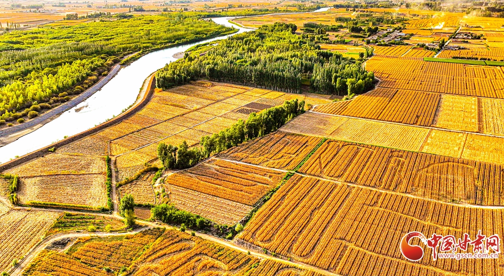 9月26日傍晚,夕陽(yáng)映照下的黑河張掖臨澤縣鴨暖鎮(zhèn)段,蜿蜒流淌的河水與兩岸鋪滿金色的大地交相輝映,盡顯盎然生機(jī),共同勾勒出一幅金秋豐收的壯美畫卷。