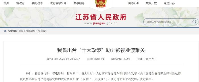 2月19日,江蘇省八部門聯(lián)合發(fā)布《關(guān)于支持全省電影業(yè)應(yīng)對新冠肺炎疫情影響促進(jìn)平穩(wěn)健康發(fā)展的政策措施》,即“影十條”,從落實稅收優(yōu)惠政策、加強(qiáng)財政支持力度、加大信貸投放、減免房租等十方面幫助電影業(yè)。
