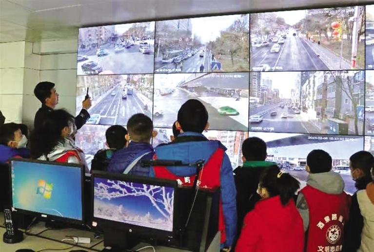 在指揮中心,民警向孩子們介紹了監(jiān)控視頻,講解了電子警察的作用,并通過(guò)監(jiān)控畫面詳細(xì)講解交警日常查處違法及出警派警流程。