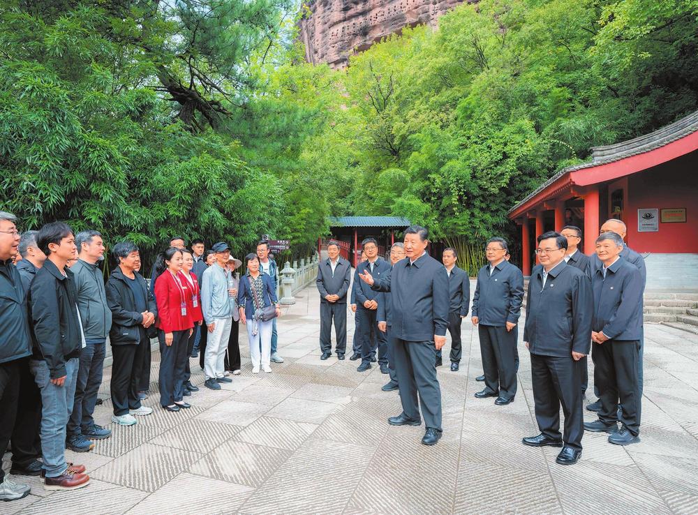 9月10日至13日,中共中央總書記、國家主席、中央軍委主席習近平在甘肅考察。這是11日上午,習近平在天水市麥積山石窟考察時,同現(xiàn)場游客親切交流。新華社記者翟健嵐