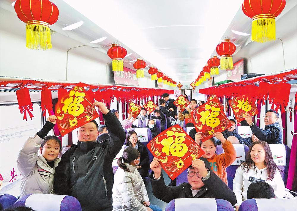 7504次“富民號(hào)”列車上張燈結(jié)彩,歡聲笑語。新春佳節(jié)來臨之際,無數(shù)人心懷著對(duì)家鄉(xiāng)的眷戀,踏上溫馨的回家之路。 新甘肅·甘肅日?qǐng)?bào)記者丁凱攝