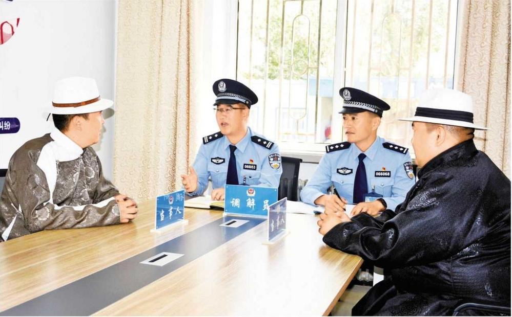 肅北縣公安局黨城派出所民警為牧民調(diào)解矛盾糾紛(2024年5月21日拍攝)。 肅北縣委政法委供圖