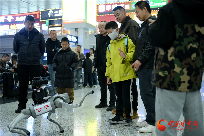 蘭州西站派出所民警利用機(jī)器犬開展治安巡邏防范、法治宣傳等各項(xiàng)工作