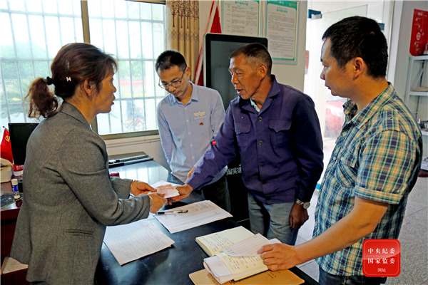 湖南省益陽市資陽區(qū)長春鎮(zhèn)幸福村村級義務監(jiān)督員主動履職,全程參與并監(jiān)督發(fā)放產業(yè)扶貧分紅資金,確保每一筆民生資金落到實處。(湖南省益陽市資陽區(qū)紀委監(jiān)委 張偉敏 攝)