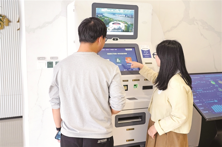 5月10日,浙江省平湖市林埭鎮(zhèn)徐家埭村的數(shù)智生活館內(nèi),村民在工作人員的幫助下,使用政務(wù)服務(wù)長三角“一網(wǎng)通辦”終端辦理業(yè)務(wù)。金苗 攝