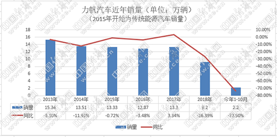 2006年,力帆推出首款轎車力帆520,新車不足5萬元的售價在當時引發(fā)關注,月銷量一度達到5000輛。2013年,力帆年銷售汽車15.34萬輛,成為汽車界的一匹黑馬。然而,好景不長。自2016年開始,力帆汽車進入下行趨勢,目前更是步履維艱。力帆產(chǎn)銷快報顯示,2019年1-10月,力帆傳統(tǒng)乘用車累計銷售2.2萬輛,同比下滑73.5%,10月僅銷售29輛;新能源累計銷售2458輛,同比下降65.42%,10月僅銷售423輛。