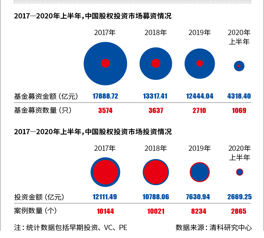 2020年上半年市場(chǎng)共有1069只基金完成新一輪募集,金額總計(jì)4318.40億元人民幣,同比下降29.5%;市場(chǎng)共發(fā)生2865起投資事件,涉及金額2669.25億元,同比分別下滑32.7%、21.5%。