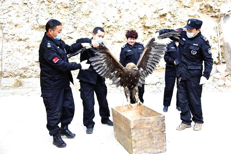 截至3月1日,經(jīng)過管護(hù)站管護(hù)人員的精心喂養(yǎng),金雕進(jìn)食進(jìn)水已經(jīng)正常,身體恢復(fù)了健康,具備野外生存能力、符合放生的條件,最終放歸大自然。金雕屬鷹科、真雕屬的猛禽,是國家一級保護(hù)動物,以其敏捷有力地飛行而著稱,以大中型的鳥類和獸類為食。